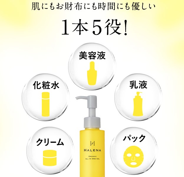 ハレナ オールインワンジェルは、化粧水・美容液・乳液・クリーム・パックの5役を1本で担う多機能スキンケア製品。